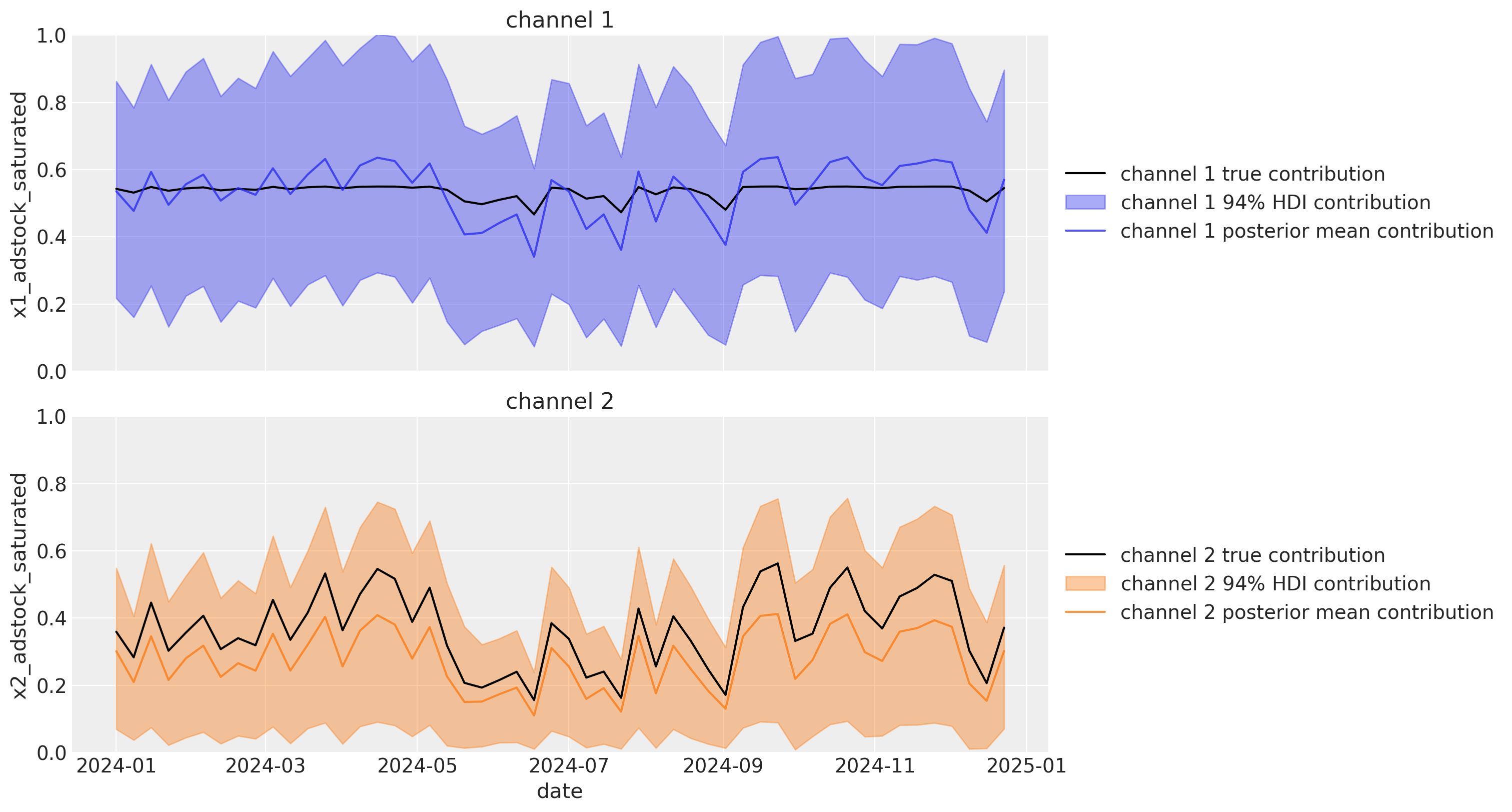 We can also visualize the channel contributions over time. The wide HDI’s in the plot below shows that we have considerable uncertainty in the channel contributions. We can also see that the posterior means of the channel contributions are quite far off the mark of the actual channel contributions. Again, these true channel contributions are only known to us in this synthetic data example and would not be available to us in a real world scenario.