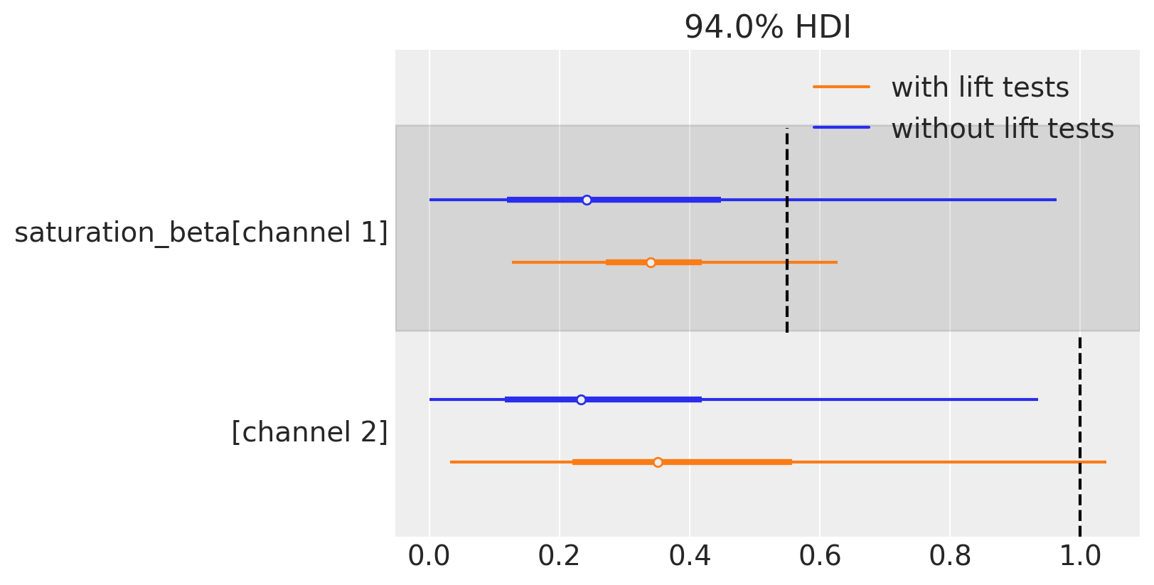 In order to avoid confusion with the plot above, the actual saturation curves are represented by the dashed lines, while the direct contribution curves are represented by the points. If lift tests can help us in this situation of high spend correlation, then we should be able to detect this by: a) achieving better parameter estimates, and b) correspondingly, getting better estimates of the saturation curves.