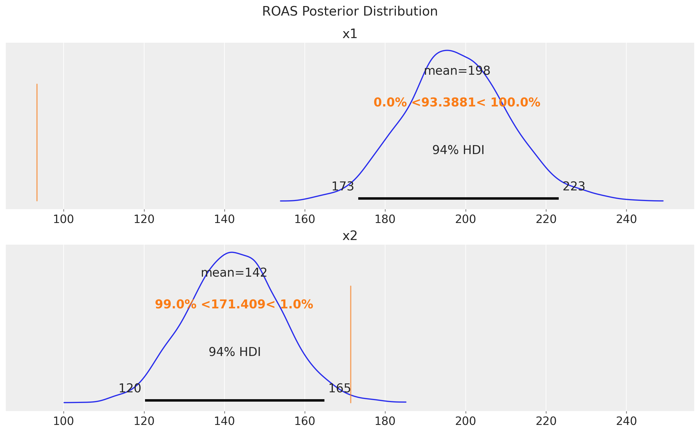 Finally, let’s compute the ROAS for the x1 and x2 channels.
